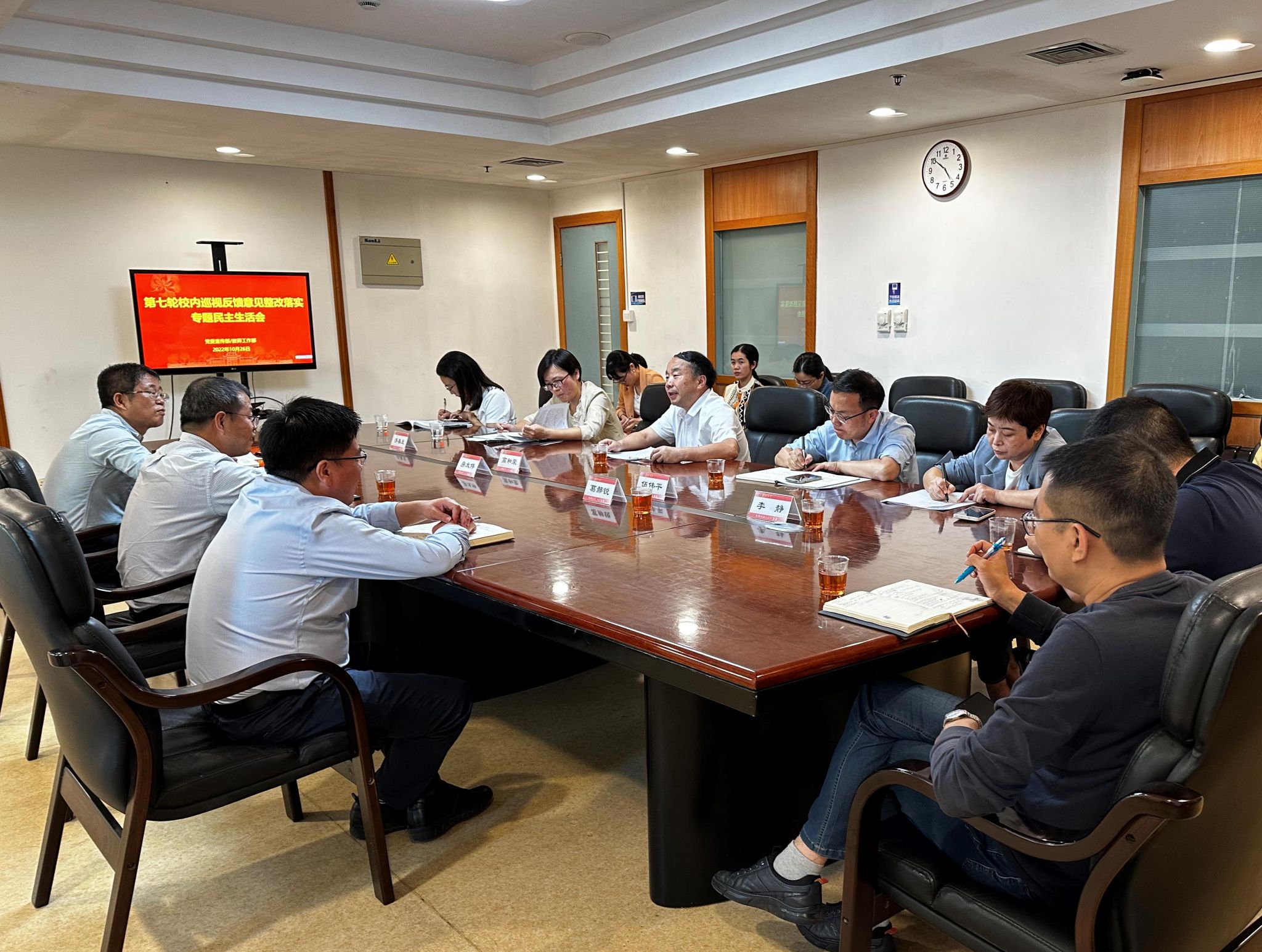 10月26日下午,党委宣传部/教师工作部召开第七轮校内巡视反馈意见整改专题民主生活会。纪检监察机构第一纪检监察室主任房太伟、校党委组织员兼党的建设办公室副主任葛郝锐、巡视办副主任洪真裁到会指导。党委宣传部/教师工作部部长高和荣主持会议。