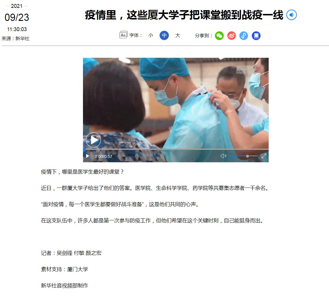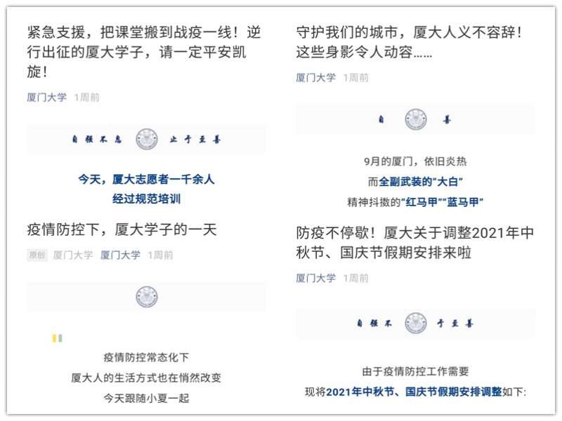 《守护我们的城市,厦大人义不容辞!这些身影令人动容……》《疫情防控下,厦大学子的一天》《紧急支援,把课堂搬到战疫一线!逆行出征的厦大学子,请一定平安凯旋!》……从9月13日起,官方微信每日一报道,学校主页、微博也同步推出相关内容,一篇篇报道,全面展现我校抗疫举措,以及师生员工舍小家顾大家、全校各单位守望相助共克时艰同心抗疫的感人故事。9月22-23日,《厦门大学报》全面报道学校抗击本轮疫情的工作部署、举措和师生员工抗疫先进事迹,策划推出4个版的特刊。